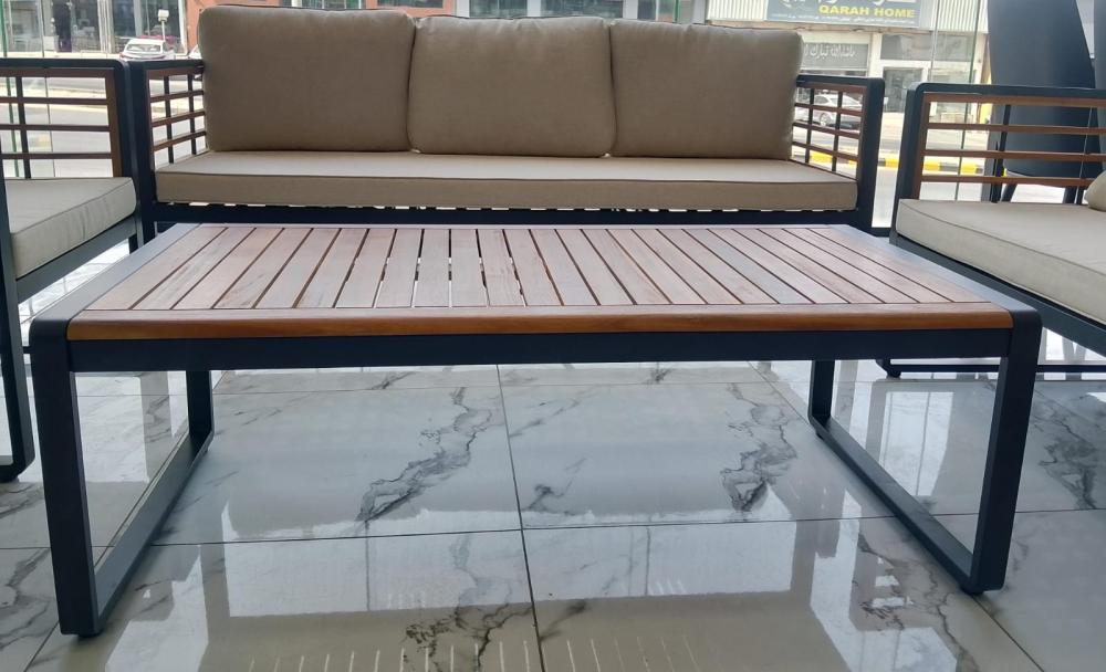 • الطاولة: طاولة قهوة مركزية بسطح خشبي طبيعي وإطار معدني متين