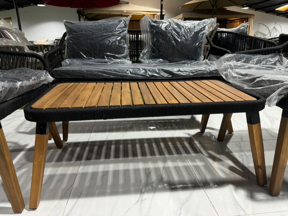 - طاولة القهوة:الإطار: مصنوع أيضًا من الخشب ، مما يطابق الأريكة والكراسي.
