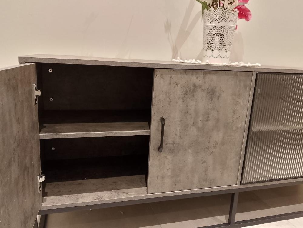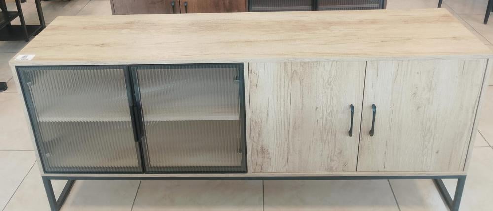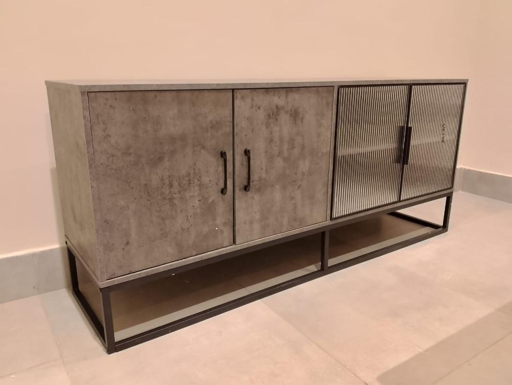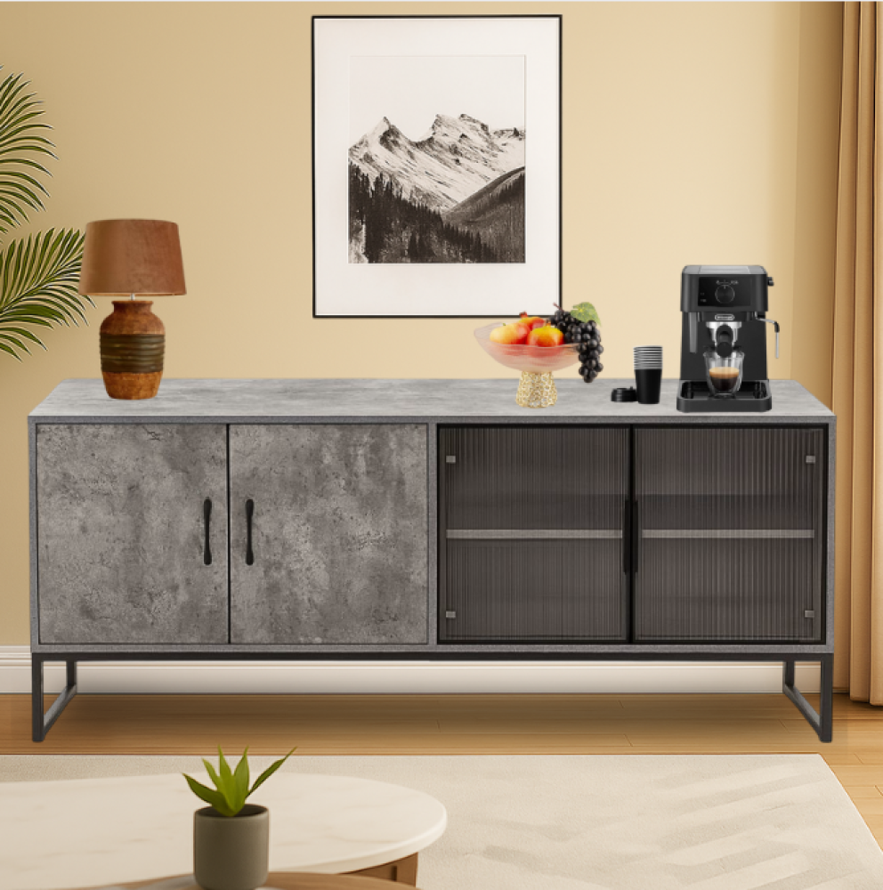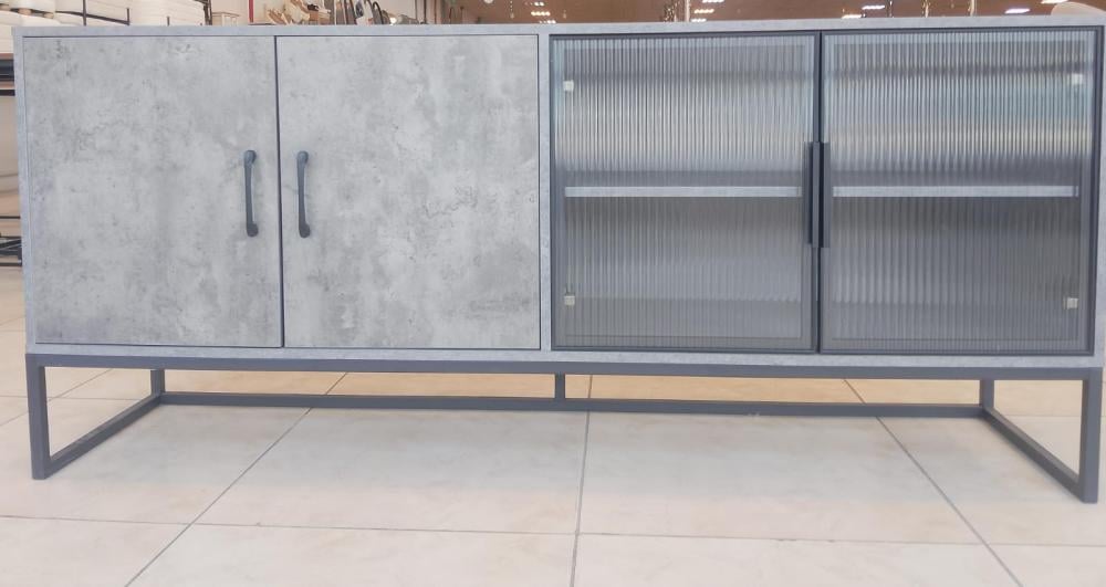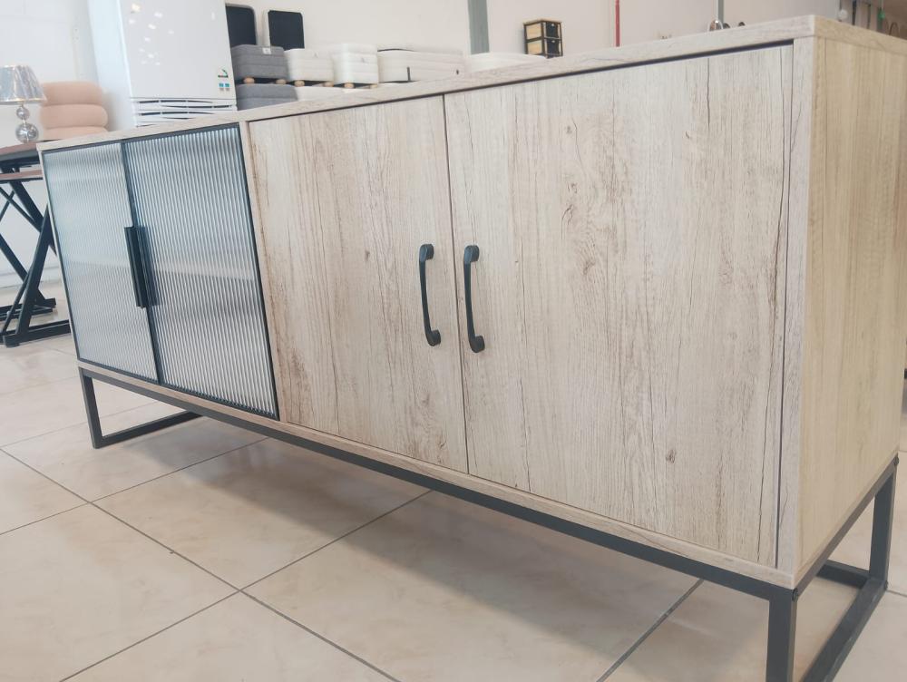 يأتي البوفية بأربعة أبواب (2 زجاج + 2 خشب) تمنحك مزيجاً من العرض والحفظ، مع قاعدة معدنية بطول الدولاب تضيف لمسة جمالية وقوة إضافية لثبات أفضل.