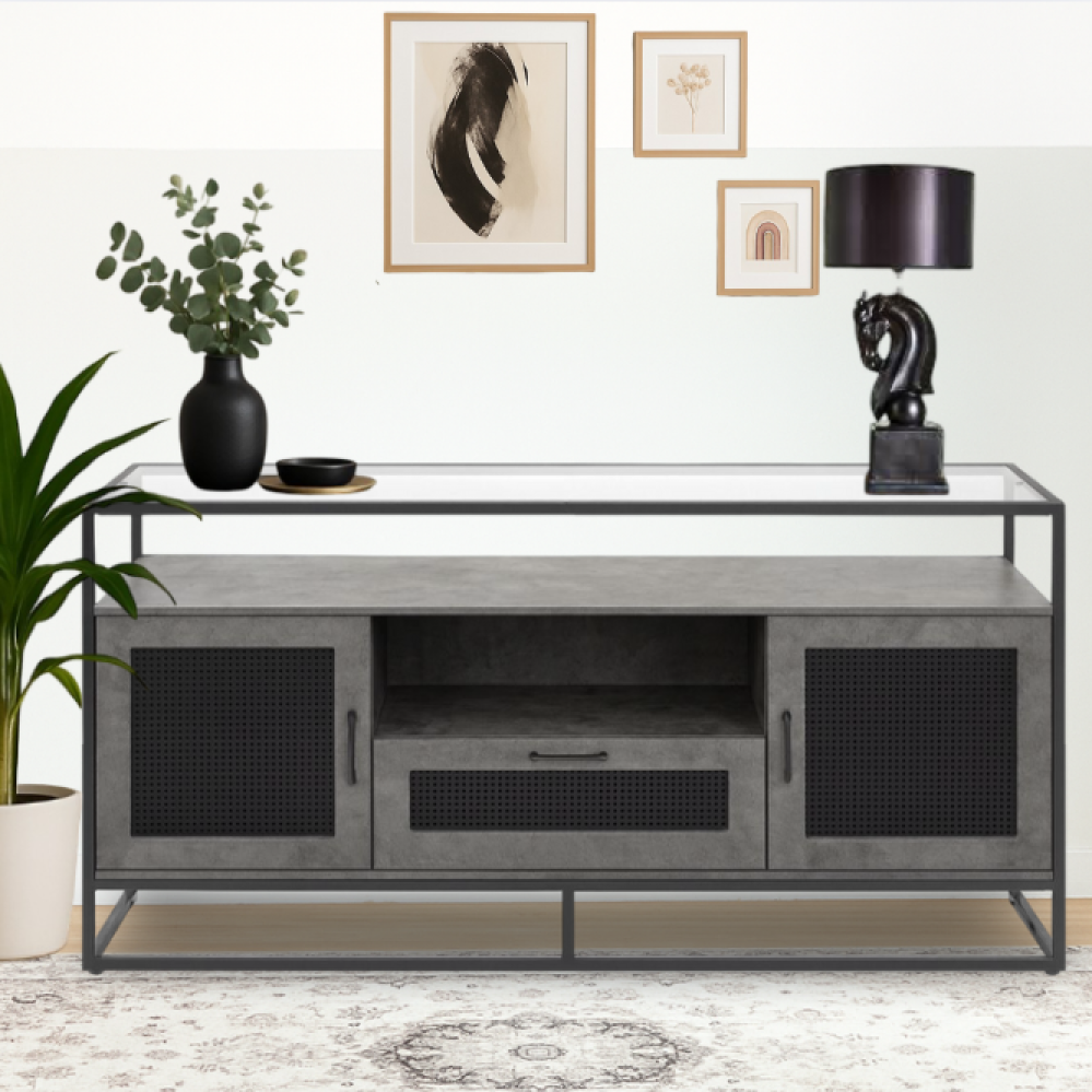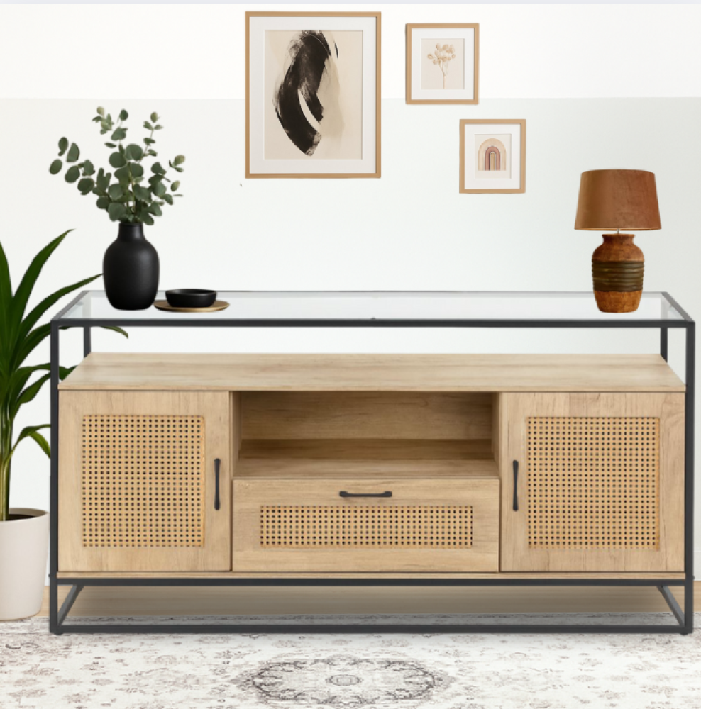 - التصميم: يحتوي على 2 درفة + درج + رف مفتوح لتلبية مختلف احتياجات التخزين والديكور