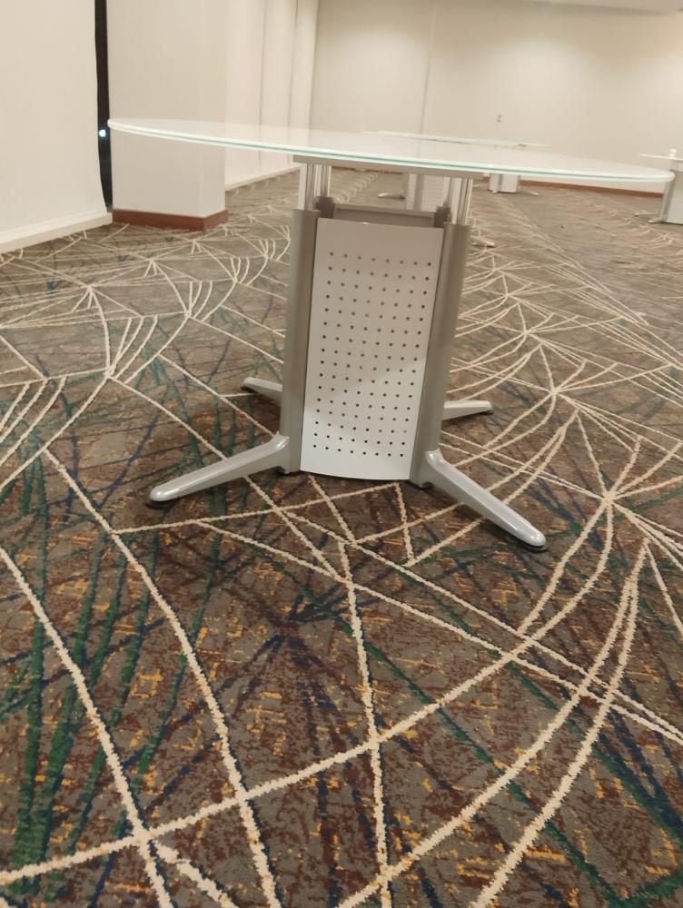 تصميم عصري: تتميز هذه الطاولة بتصميمها الدائري الأنيق الذي يعكس الحداثة والرقي. سطح الطاولة الزجاجي الشفاف يضفي لمسة من الانفتاح والاتساع على المساحة، بينما القاعدة المعدنية ذات الثقوب تضيف لمسة من الحيوية والجمال.