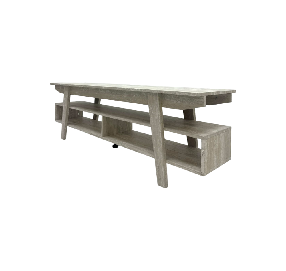 طاولة تلفاز خشبية بتصميم فاخر يجمع بين العملية والجمال. تتميز بأنها مفتوحة من جميع الاتجاهات لسهولة الاستخدام والتنظيف، كما تحتوي على رفّين عمليين لتخزين وتنظيم الأجهزة والملحقات بشكل أنيق. مصنوعة من خامات عالية الجودة لتمنحك تجربة استخدام مريحة ولمسة فاخرة تضيف جمالاً لديكور غرفة المعيشة.