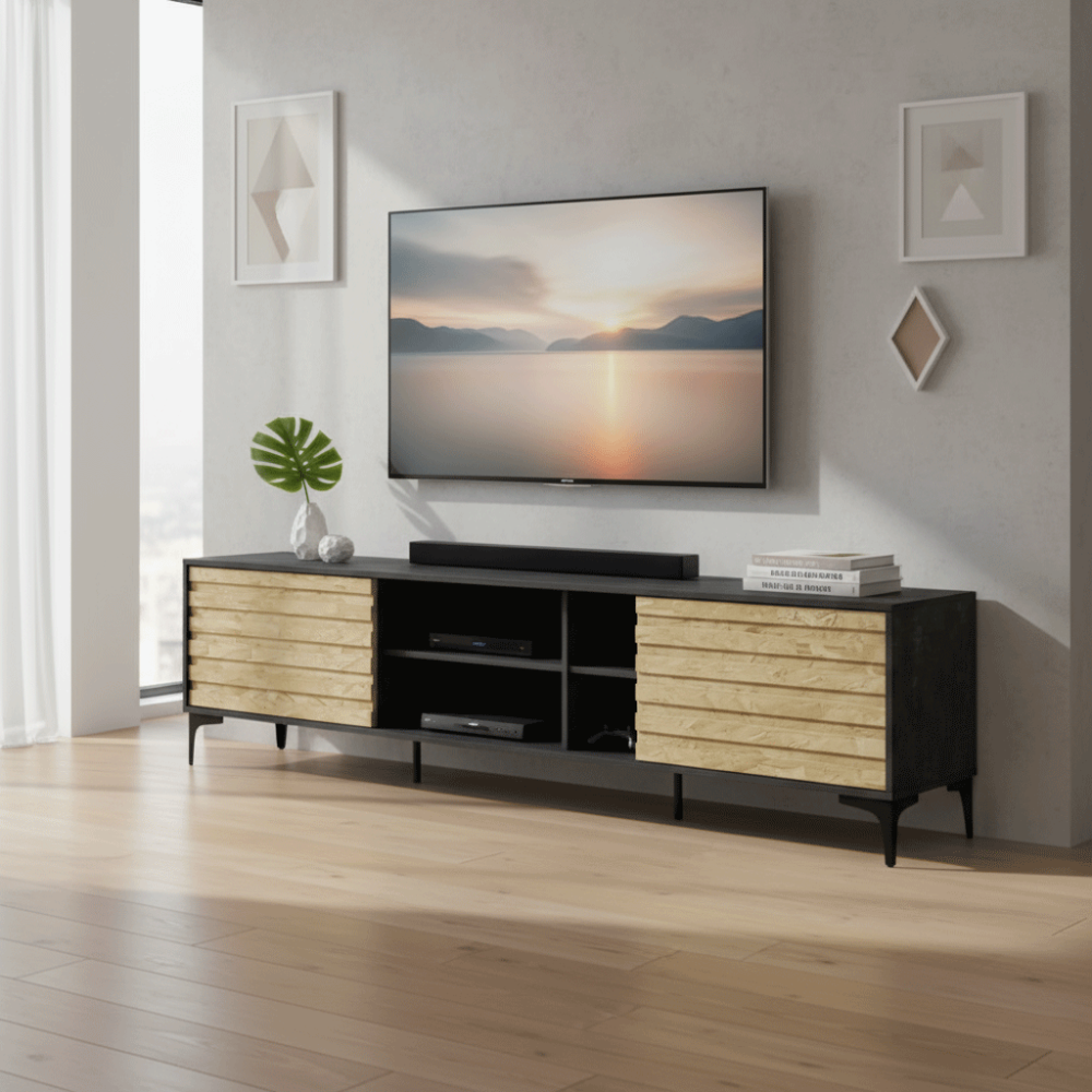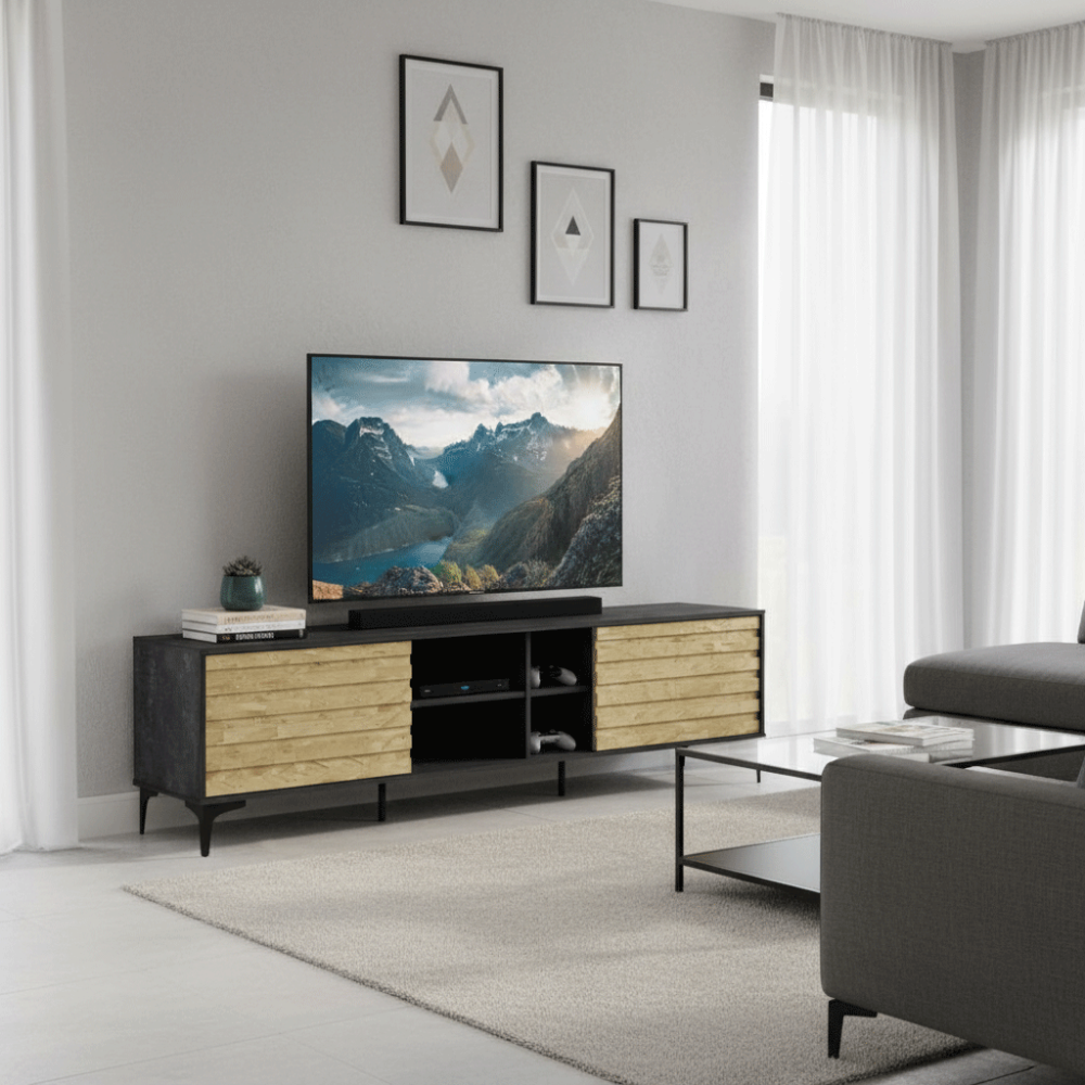 طاولة تلفزيون أنيقة وعصرية بمقاسات مختلفةوصف المنتج :الخامة: مصنوعة من الخشب، مما يضفي عليها مظهرًا طبيعيًا ودافئًا.الألوان: تتألق الطاولة بمزيج جذاب ...