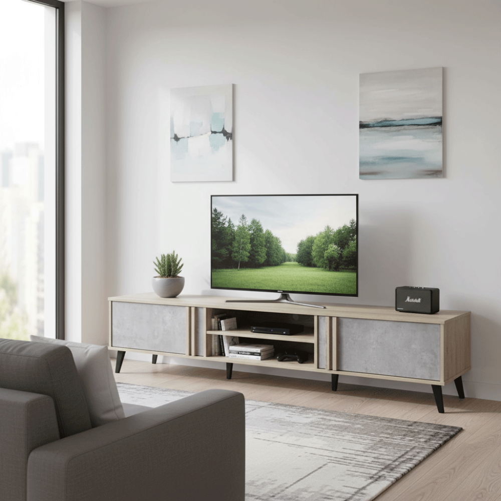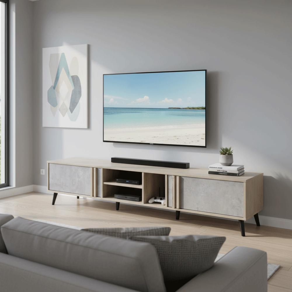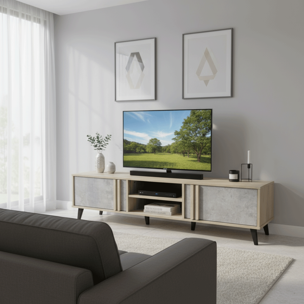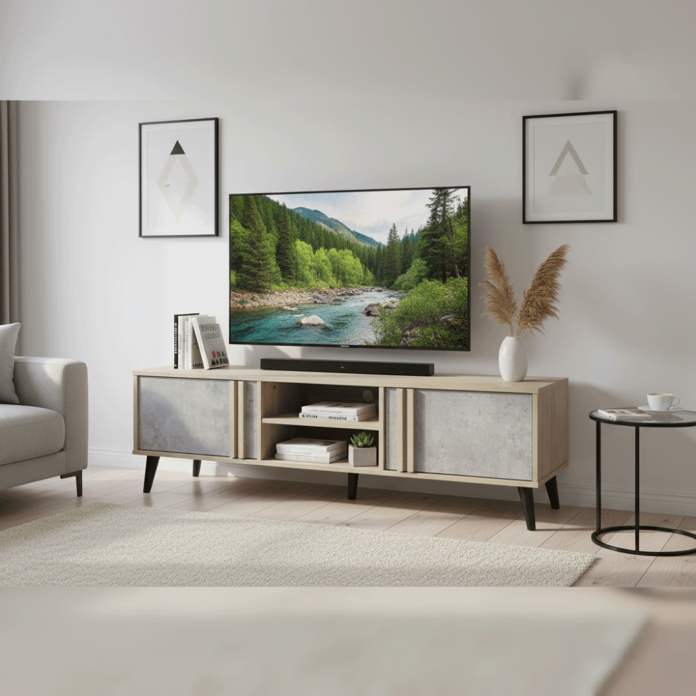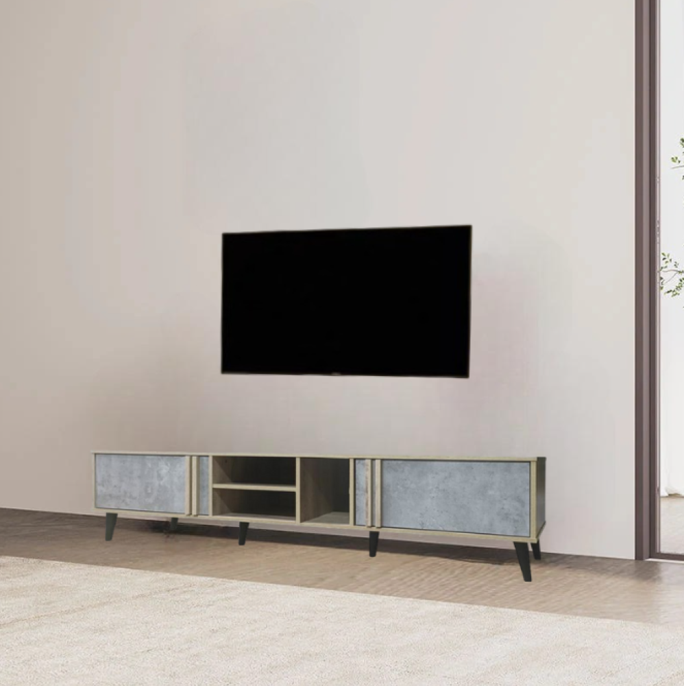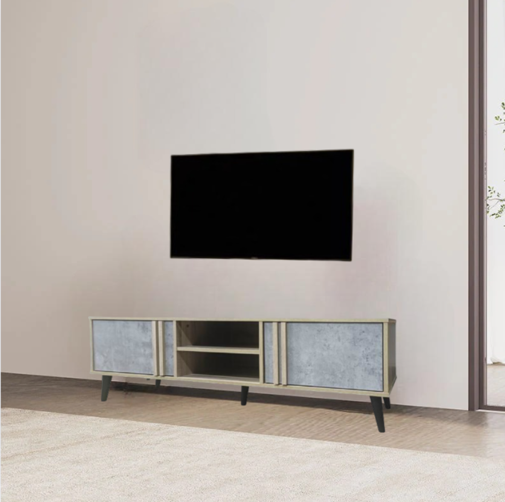 تعتبر طاولة التلفزيون هذه قطعة أثاث أساسية في أي غرفة معيشة، فهي تجمع بين الأناقة والوظيفة. تتميز بتصميمها العصري والبساطة، حيث تتناسب مع مختلف الديكورات الداخلية.