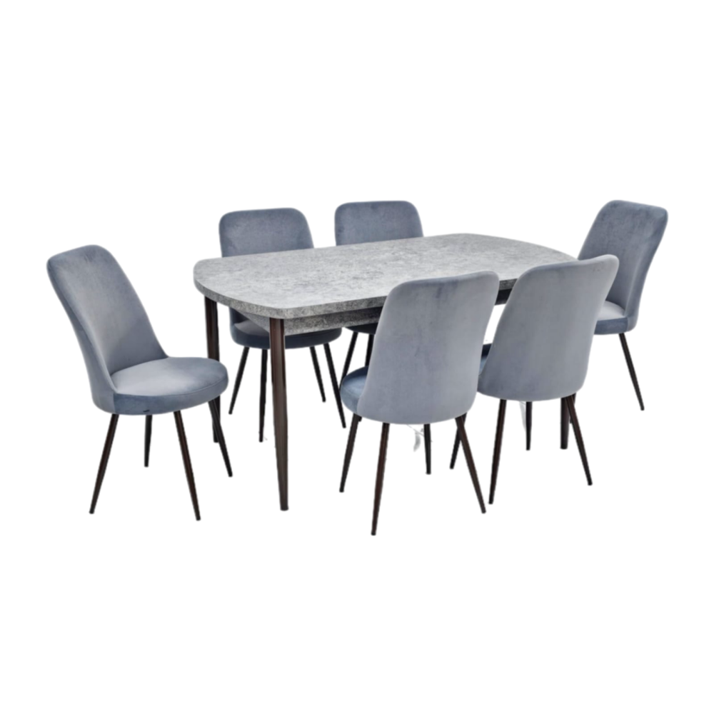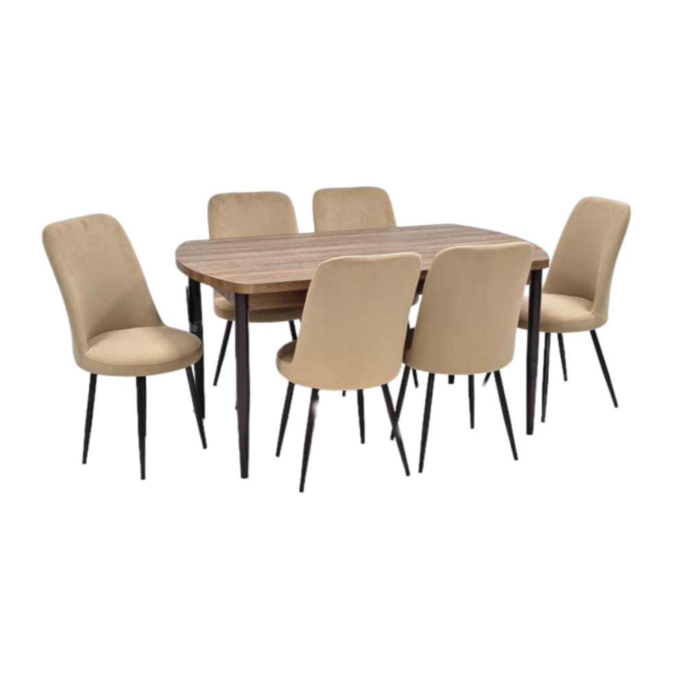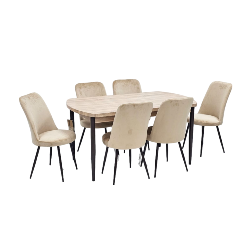 تصميم عصري وأنيق: تتميز هذه الطاولة بتصميمها العصري والأنيق الذي يجمع بين الألوان المحايدة والخطوط النظيفة، مما يضفي لمسة من الرقي والحداثة على أي غرفة طعام.