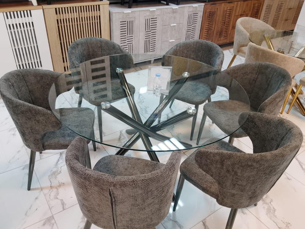 تتميز هذه الطاولة بتصميمها الأنيق والعصري الذي يجمع بين جمال الزجاج وبريق الاستيل. سطح الطاولة المصنوع من الزجاج الشفاف يعطي إحساسًا بالرحابة والنقاء، بينما أرجلها المصنوعة من الكروم الاسود تضيف لمسة من الفخامة والأناقة.
