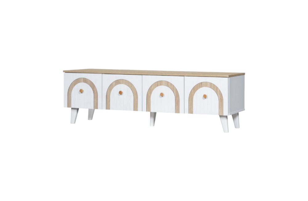 الطاولة مزودة بأربعة أبواب تخزين عملية مع مقابض دائرية خشبية أنيقة، لتوفر لك المساحة المثالية لحفظ الأجهزة، الكتب، أو الإكسسوارات المنزلية مع الحفاظ على تنظيم وأناقة المكان.