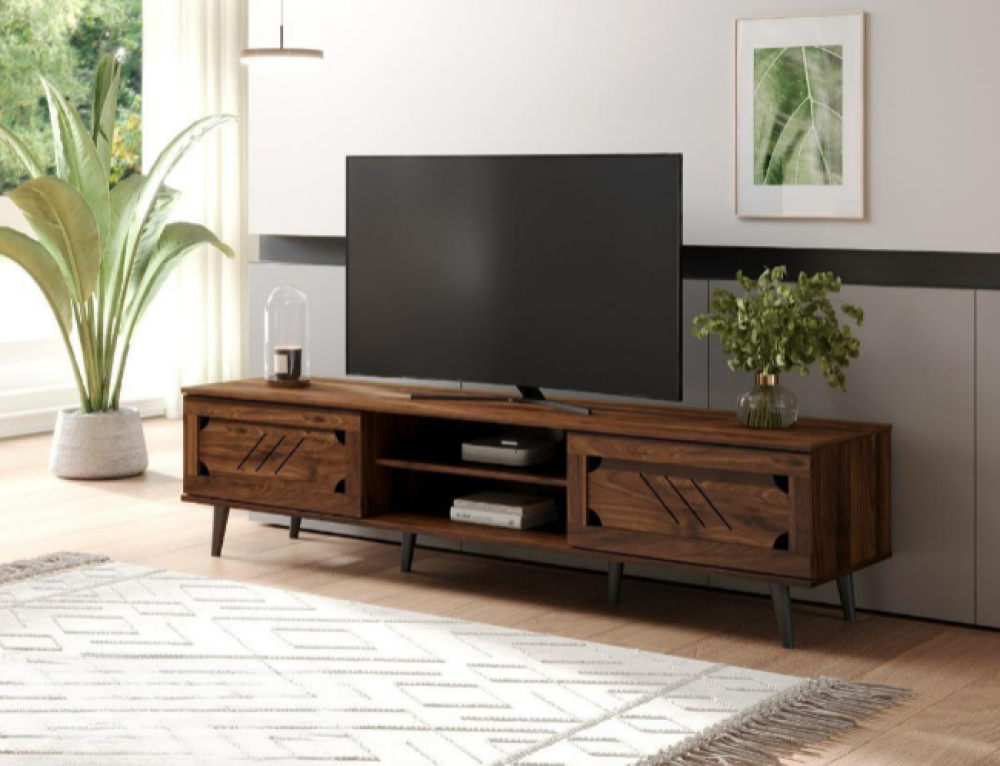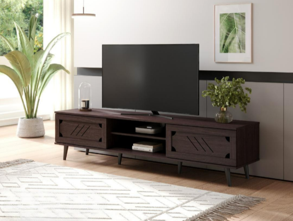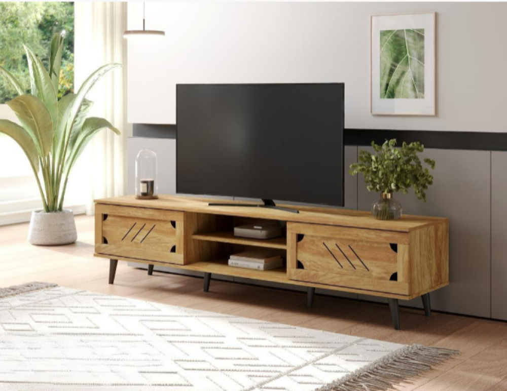 سعة تخزينية كبيرة: أدراج مغلقة على الجانبين مع رفوف وسطية للأجهزة أو الديكورات.