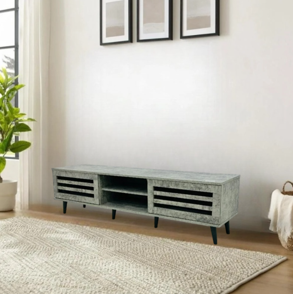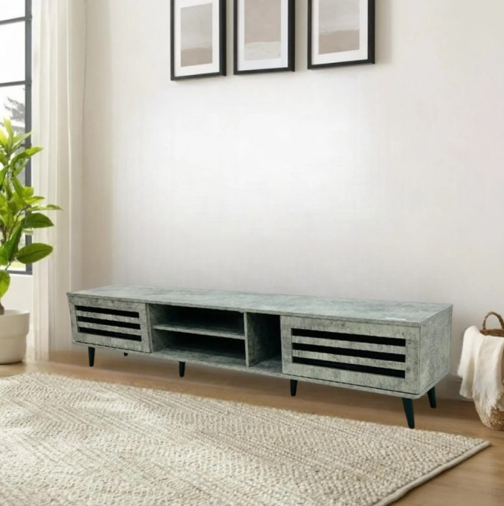 تتميز الطاولة بتصميم هندسي أنيق يتضمن بابين جانبيين لتخزين مرتب وآمن، بالإضافة إلى رفين مفتوحين في المنتصف بمقاسات متفاوتة، مثاليين لأجهزة الاستقبال، مشغلات الوسائط، أو لعرض القطع الزخرفية المفضلة لديك.