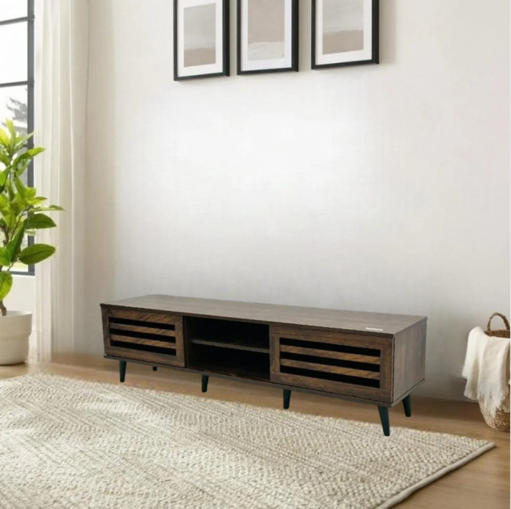 تتميز هذه الطاولة بتصميم هندسي جذاب يشمل بابين جانبيين للتخزين المخفي، ورفين مفتوحين في المنتصف بأحجام متنوعة لتوفير عرض عملي وأنيق للأجهزة الإلكترونية أو القطع الزخرفية.