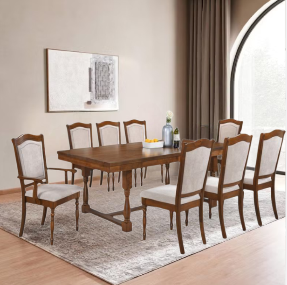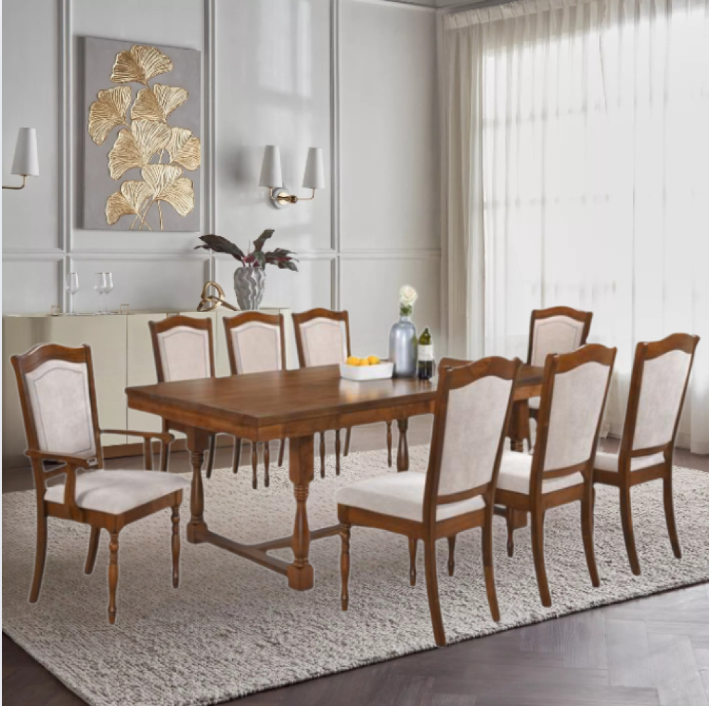 تصميم كلاسيكي راقٍ: يجمع بين الأناقة التقليدية والتفاصيل المنحوتة في الأرجل وظهور الكراسي، مما يضفي طابعاً ملكياً على غرفة الطعام.