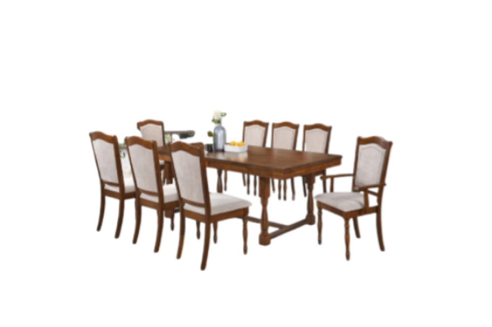 ارفعوا مستوى فخامة غرفة طعامكم مع طقم طاولة الطعام الفاخر هذا من متجرنا المتميز، المصمم لتقديم تجربة تناول طعام استثنائية. يتكون هذا الطقم من طاولة طعام خشبية كبيرة بلون بني دافئ، مصممة بأرجل كلاسيكية منحوتة تضفي لمسة من الرقي، وثمانية كراسي طعام أنيقة، ستة منها بدون ذراعين وكرسيان بذراعين، جميعها تتميز بظهر منحوت ومقاعد مبطنة ومغطاة بقماش بيج فاتح. إنه الخيار الأمثل للمنازل الكبيرة التي تقدر الجودة العالية، الأناقة الكلاسيكية، والراحة الفائقة لاستضافة العائلة والأصدقاء.