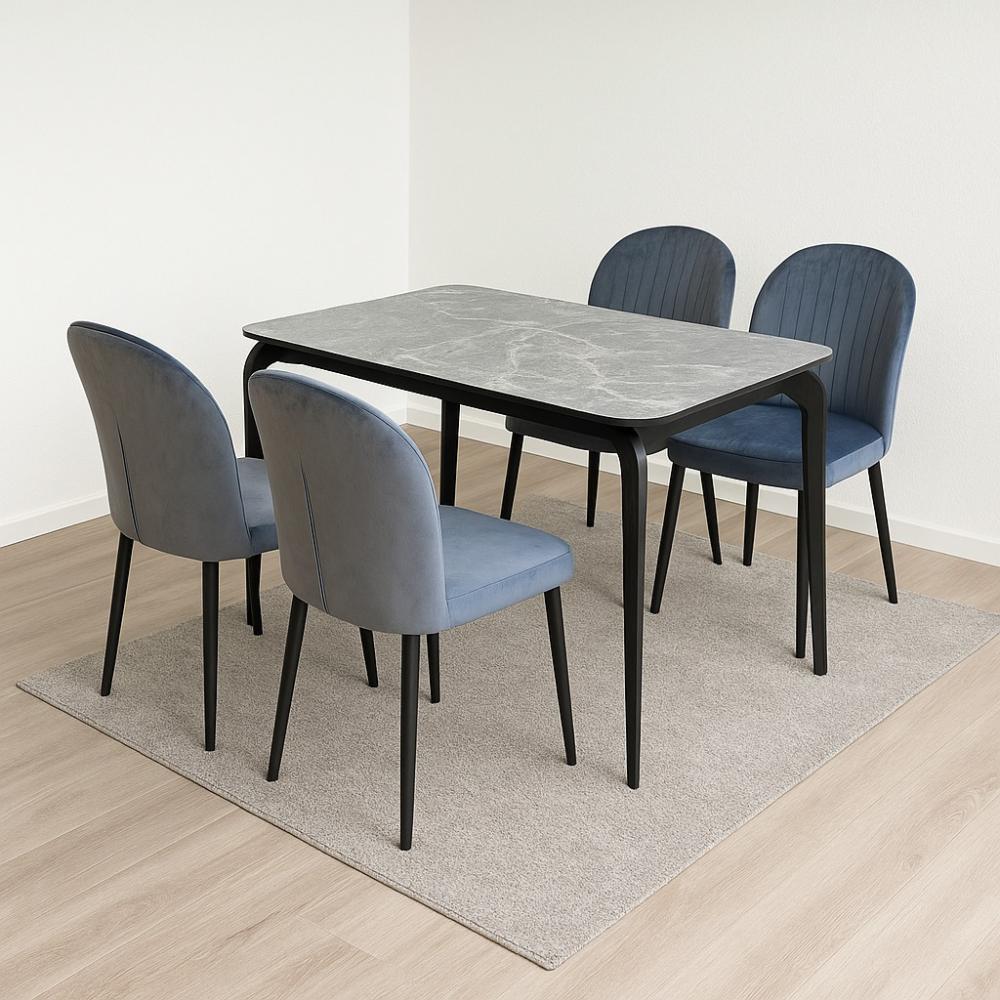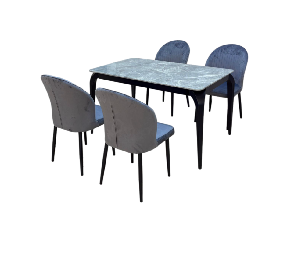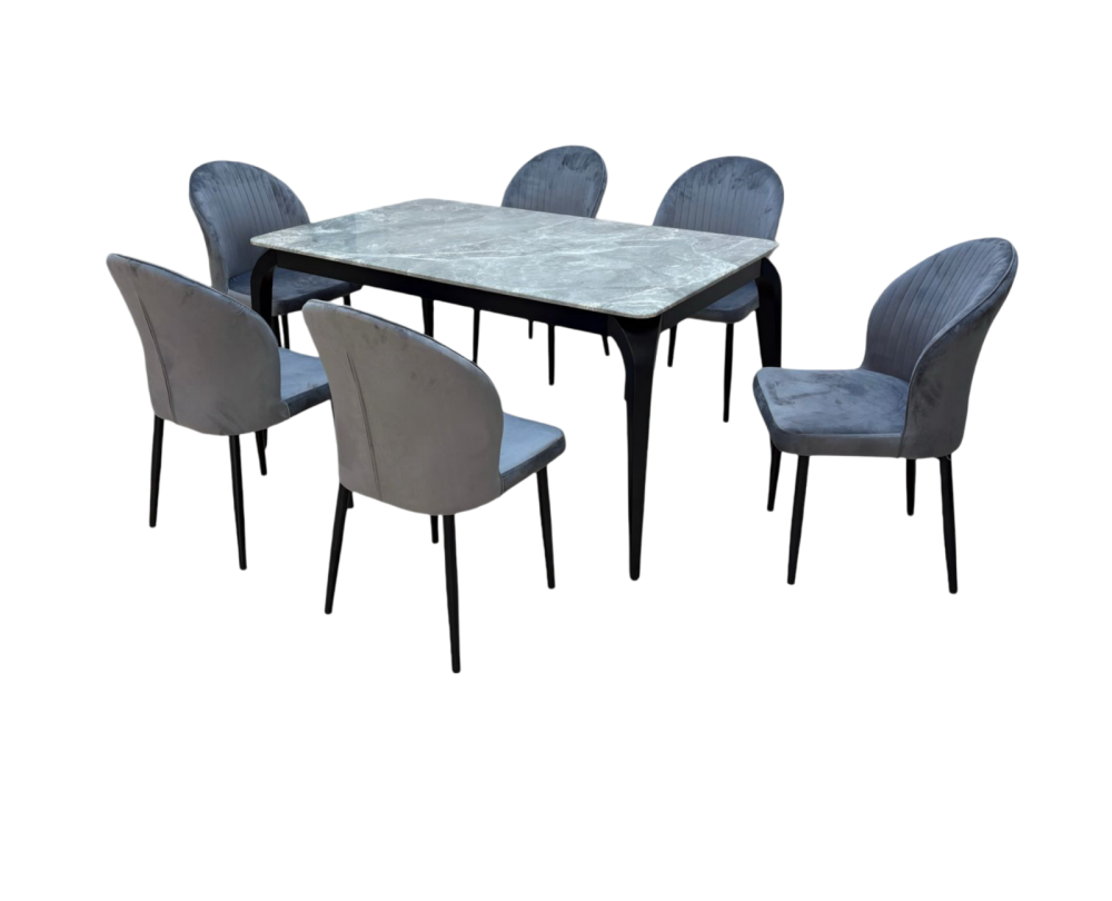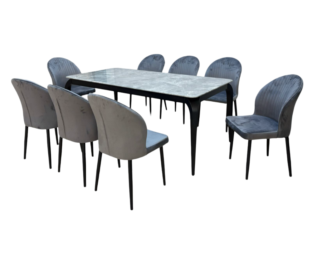 استمتع بأناقة ورقي لا مثيل لهما مع طقم السفرة الفاخر الذي يجمع بين التصميم العصري والمتانة العالية. يتكون الطقم من طاولة طعام مستطيلة بسطح رخامي رمادي راقٍ مزين بعروق بيضاء طبيعية، تضيف لمسة من الفخامة والرقي إلى أي مساحة. تستند الطاولة إلى أرجل معدنية سوداء بتصميم منحني أنيق، مما يضمن قوة وثباتًا عاليًا للاستخدام اليومي.