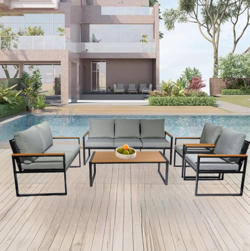 - الخامة: هيكل معدني قوي مقاوم للصدأ مصمم لتحمل الظروف الجوية القاسية مع لمسات خشبية طبيعية تضيف دفئًا وجمالًا للمظهر العام.