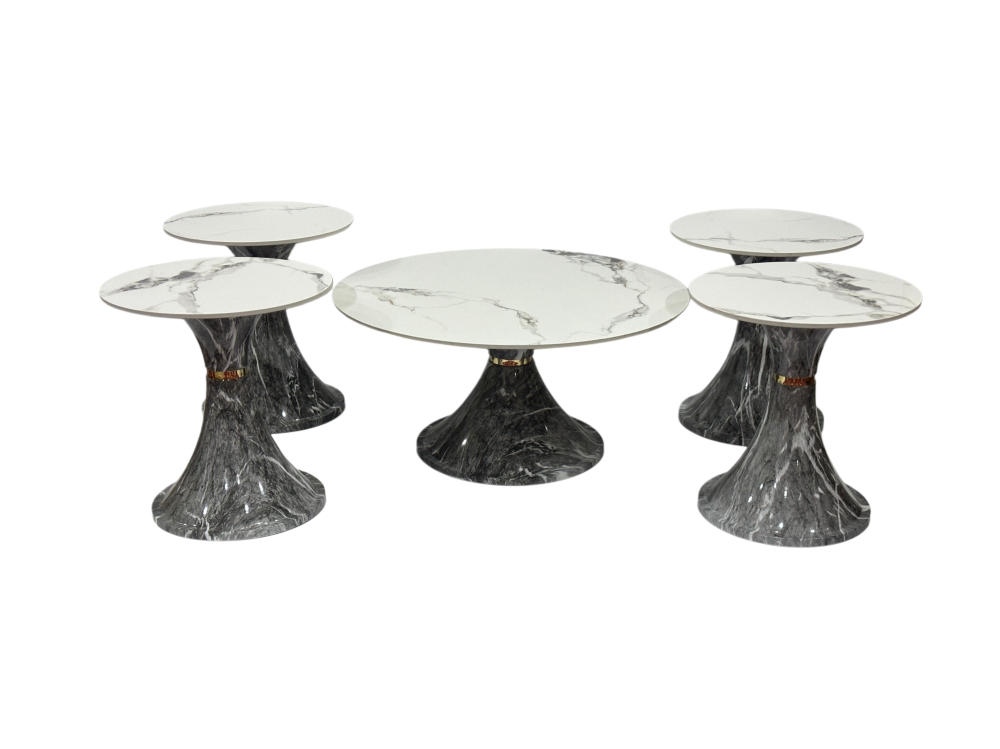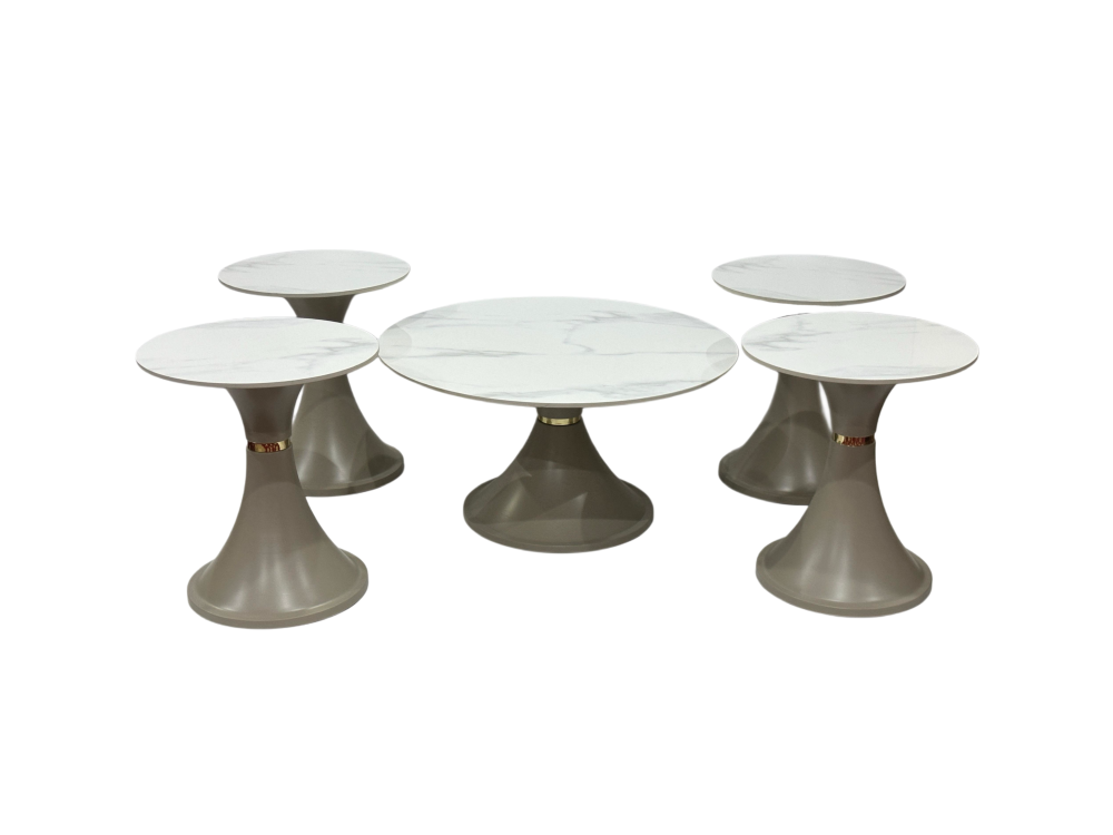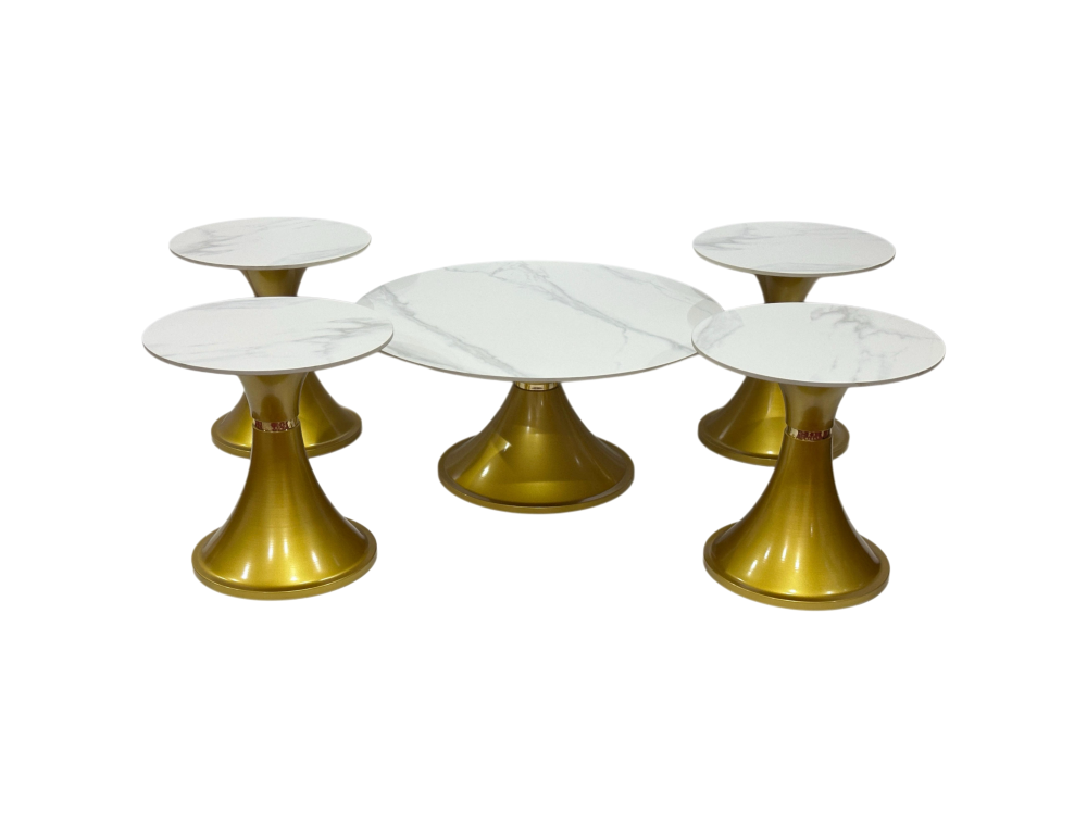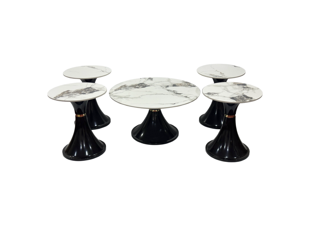 - العدد: يتكون الطقم من 5 قطع: طاولة مركزية وأربع طاولات جانبية، مما يوفر مرونة في الاستخدام وتلبية مختلف الاحتياجات.