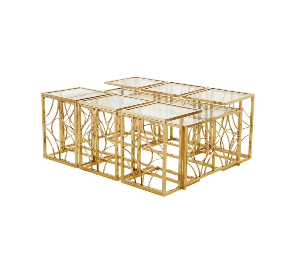 الخامة: مصنوعة الطاولات من الاستيل عالي الجودة مع طلاء لامع، مما يضفي عليها متانة وقوة، بينما يتميز سطح الطاولة بالزجاج الشفاف الذي يعكس الضوء ويضفي لمسة من الرقي.