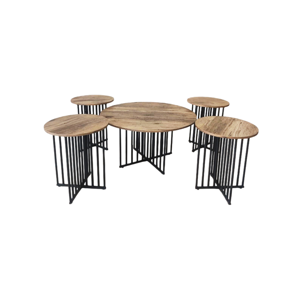 هذا الطقم الأنيق والمبتكر هو الحل الأمثل لإضافة لمسة من الأناقة والعملية إلى مساحتك. يتكون الطقم من طاولة مركزية كبيرة وأربع طاولات جانبية أصغر حجمًا، مما يجعله مثاليًا لاستقبال الضيوف وتقديم المشروبات والوجبات الخفيفة.