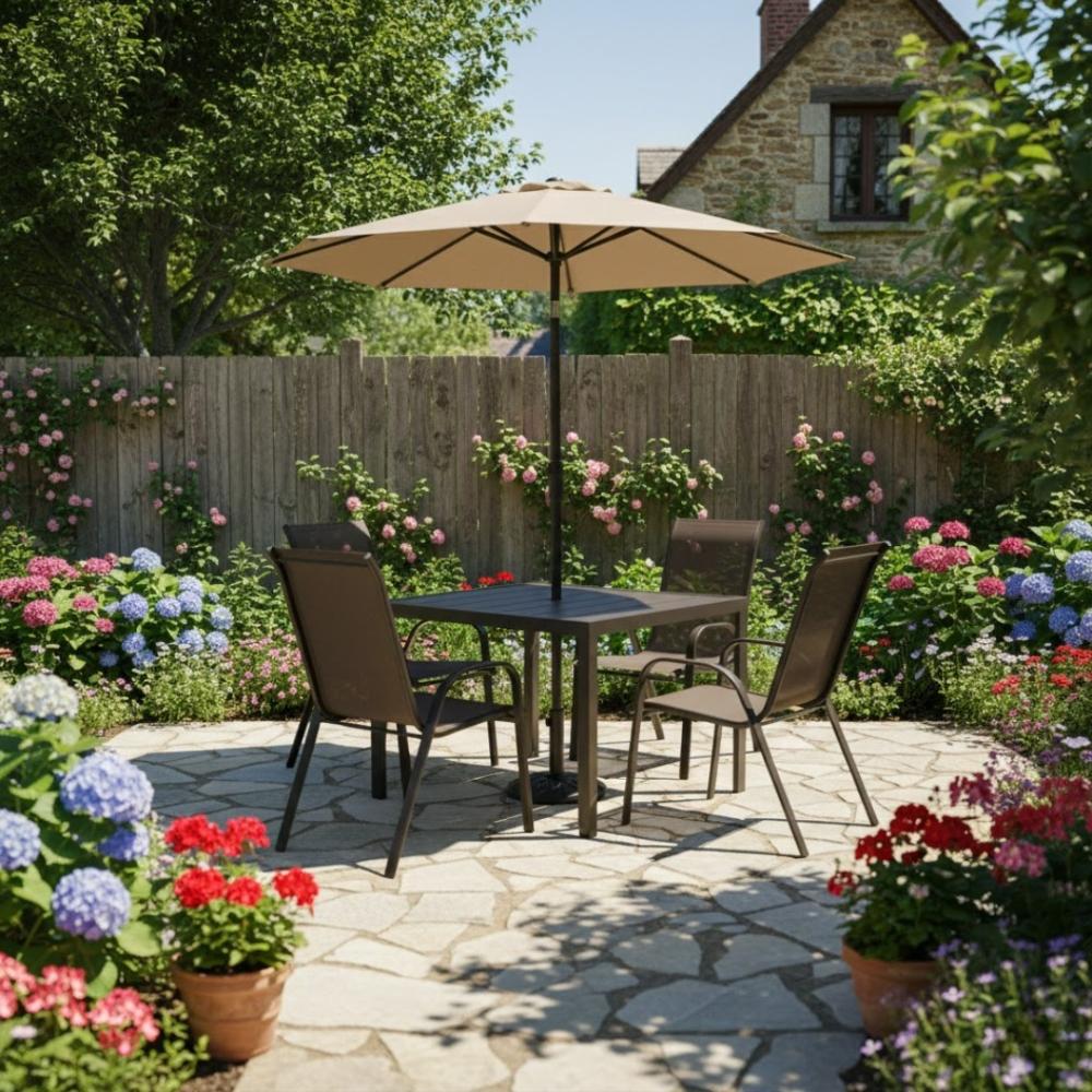 - يتكون من طاولة مستطيلة + 4 كراسي + مظلة، مما يجعله مثاليًا للاستمتاع بأجمل اللحظات في الهواء الطلق.