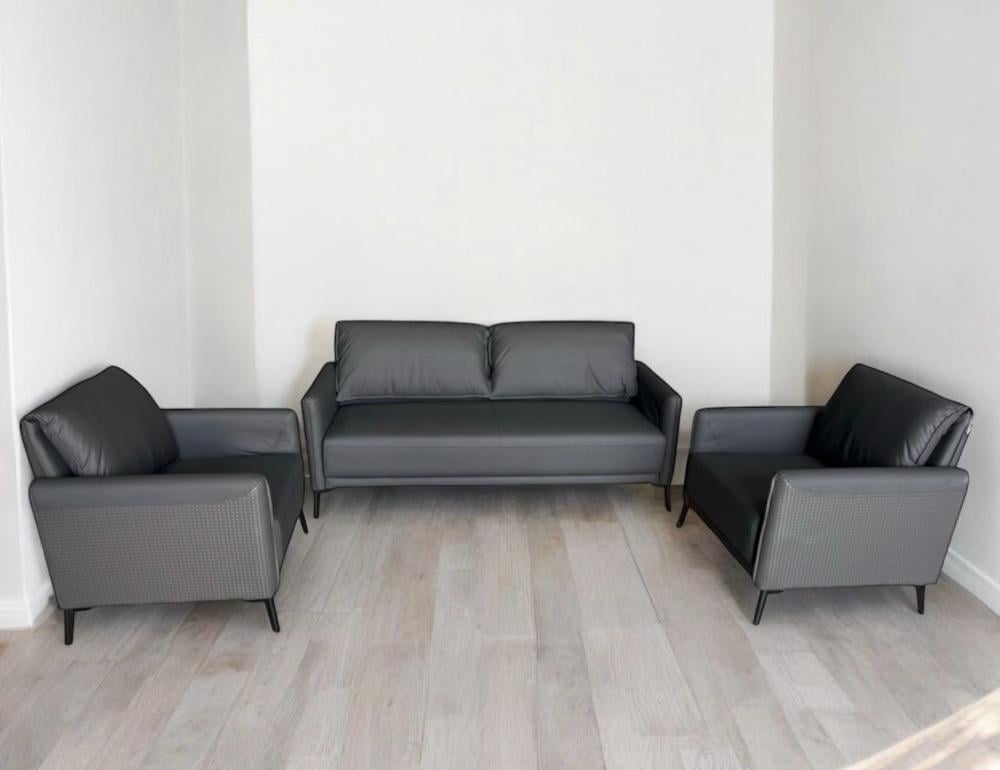 طقم كنب مكتبي أنيق وعصري بتصميم يجمع بين البساطة والفخامة. يتكون الطقم من كنبة بثلاثة مقاعد بالإضافة إلى كرسيين منفصلين، مصنوع من خامات عالية الجودة مع قماش جلدي فاخر مثالي لمساحات الاستقبال أو المكاتب التنفيذية، حيث يمنح المكان لمسة احترافية وشعورًا بالراحة.