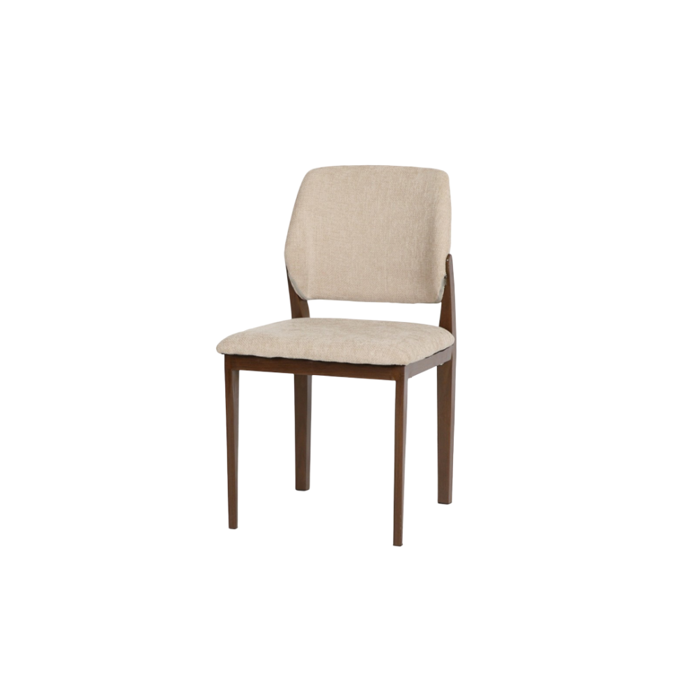 كرسي مفرد أنيق بلون بيج ناعم يبعث على الدفء والرقي. يتميز بمقعد وظهر مبطنين بقماش فخم مريح يضمن جلسة مريحة وأنيقة في الوقت نفسه.