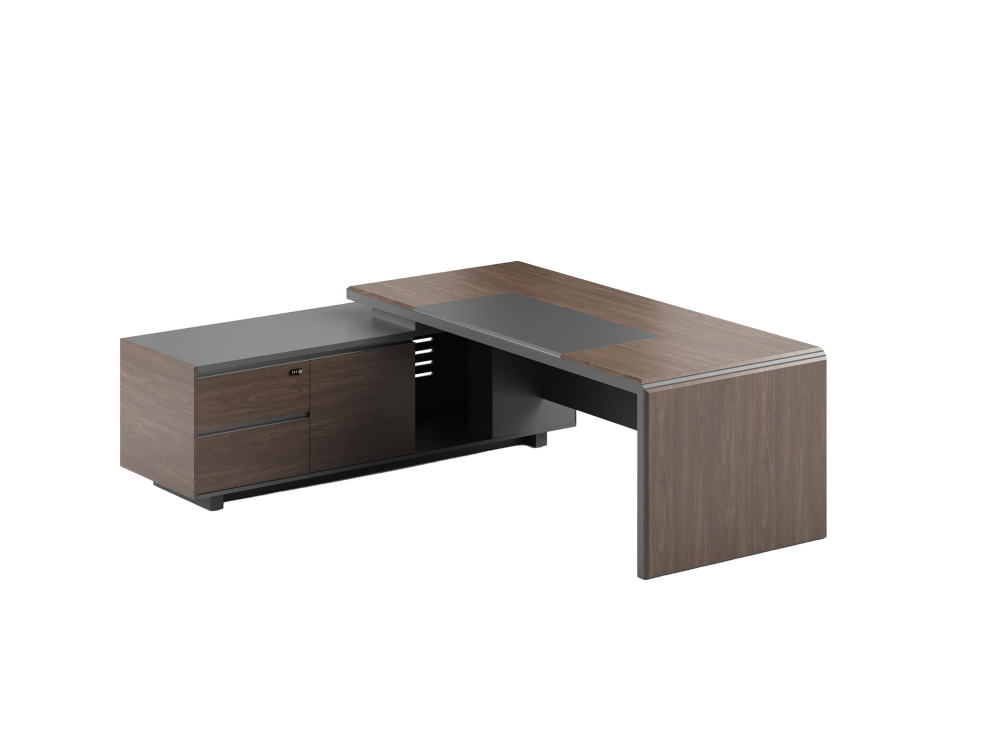 • التصميم: يتميز المكتب بتصميم عصري أنيق، حيث يجمع بين خطوط مستقيمة حادة وألوان محايدة. يتكون المكتب من قطعتين رئيسيتين: مكتب رئيسي كبير وقطعة جانبية أصغر، مما يوفر مساحة واسعة للعمل.